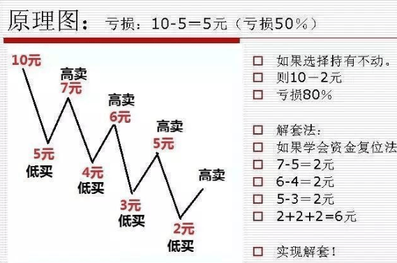 “资金复位解套法”所提倡的是通过这样的来回波段操作,来让帐户资金回到原先的初始成本位置,同样是完成了解套,相比之下消耗的时间更短,简单来说就是,上涨的时候赚钞票,下跌的时候赚股票。